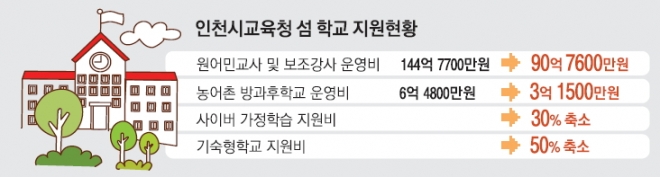 도서지역에 지원하던 다양한 교육사업 예산이 크게 줄면서 인천시 강화·옹진군 학교들은 방과후학교 개설 과목을 줄이거나 무료로 진행하던 교육사업을 수익자 부담으로 전환하는 추세다. 옹진군의 한 고등학교는 방과후학교 운영비가 절반으로 줄어들자 강사료 부담을 없애기 위해 과목을 지난해 28개에서 올해 21개로 줄이고 전 과목 무료 수강에서 벗어나 일부 과목에 대해 6만원의 수강료를 받고 있다.