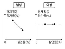 (문제)다음 그림은 A국의 성별 경제활동 참가율과 실업률의 지난 1년간 변화를 나타낸 것이다. 이에 대한 설명으로 옳은 것은? (단, 이 기간 동안 남성과 여성 각각의 노동 가능 인구는 일정하다.)