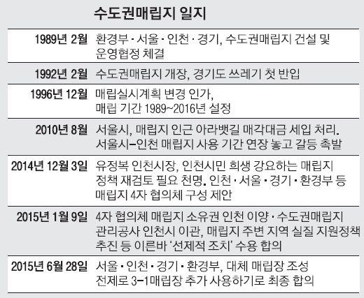 28일 서울과 인천·경기·환경부가 수도권매립지 사용을 대략 2025년까지 10년 연장하기로 합의하면서 수도권 주민들은 당장 발등에 떨어진 쓰레기 대란은 피해갈 수 있게 됐다. 수도권매립지는 당초 2016년 말 수용 능력이 한계에 이를 것으로 예측돼 사용 종료 시점도 2016년 말로 정해졌다. 하지만 서울·인천·경기 어느 곳도 대체 매립지를 확보하지 못한 상황에서 현재 매립지 사용을 중단하면 쓰레기 처리에 일대 혼란이 불가피한 상황이었다. 이번 합의로 인천시는 경제적 실리를 챙기게 됐고, 서울시와 경기도는 대체 매립지 확보를 위한 시간을 벌 수 있게 됐다.
