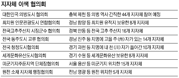 지역 명칭과 농산물 등도 협의회 매개체가 된다. 경북 안동 등 16개 지자체는 ‘전국고추주산지 시장군수협의회’, 서울 용산과 강원 원주 등 15개 지자체는 ‘미군기지주둔지역 단체장협의회’, 경기 양주 등 14개 지역은 지역이름에 고을 ‘주(州)’자가 있다는 이유로 ‘전국동주(同州)도시교류협의회’를 구성했다. 지명에 내 ‘천(川)’자가 들어가는 경기 과천 등 10개 지자체는 ‘전국청정도시협의회’를 만들었다.