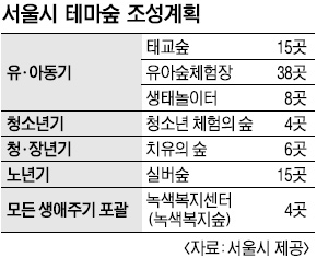시는 생애주기를 유·아동기(0~12세), 청소년기(13~24세), 청·장년기(25~64세), 노년기(65세 이상) 등 4단계로 구분했다. 유·아동기 테마숲 중 하나인 태교숲은 뱃속에서부터 피톤치드, 음이온 등의 산림치유 효과를 누릴 수 있도록 지원한다. 유아숲 체험장과 생태놀이터는 아이들이 자연과 어울리며 건강하게 자랄 수 있도록 한다.