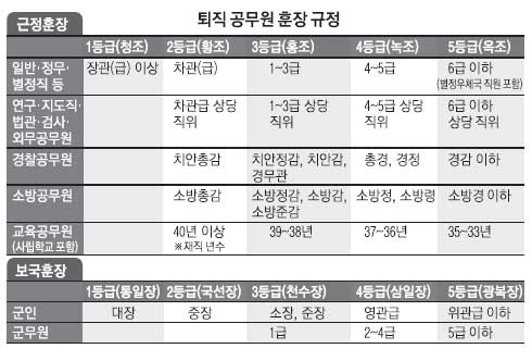 지난해 정부가 수여한 훈장 10개 가운데 9개를 퇴직공무원이 가져간 것으로 나타났다. 상훈법엔 근정훈장 대상을 ‘공무원(군인 및 군무원을 제외한다) 및 사립학교의 교원으로서 직무에 정려(힘을 다해 부지런히 노력함)해 공적이 뚜렷한 자’라고 밝혔지만 실제론 금품수수 등 비리로 처벌받지 않고 근속 연수를 채우기만 하면 수여하는 셈이다.