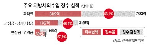 전국 243개 지자체의 과징금, 이행강제금, 부담금 등 80여종의 지방세외수입금은 2013년 결산 기준 23조여원 규모로, 전체 지방 예산의 11.7%를 차지하는 주요 수입원이다. 그러나 징수율은 국세(징수율 91.1%)나 지방세(92.3%)에 비해 크게 떨어져 평균 75.9%에 그치고 있다. 특히 또 다른 수입원인 과태료와 변상금·위약금의 경우 미수납액과 징수율은 각각 3422억원과 53.1%, 390억원과 57.6%에 불과하다.