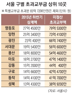시가 이번부터 세 차례에 걸쳐 자치구로부터 거둬들이겠다고 밝힌 초과교부금은 2010년 경제활성화 등을 이유로 예산을 조기 집행하면서 자치구에 초과해 배부한 조정교부금이다. 강남 등 정산할 초과교부금이 없는 자치구 6곳을 제외하면 구청당 평균 58억원이 넘는다. 시 관계자는 “자치구 재정이 어렵지만 5년이 넘도록 초과교부금을 정산하지 않는 것은 시의 재정건전성에 해를 입히는 일”이라며 자치구의 반발에 곤혹스러워하고 있다.