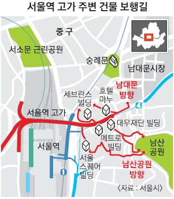 시는 서울역 고가 공원을 대형빌딩 5곳과의 연결 이후에도 다양한 방법으로 보행 접근성을 확대할 계획이다. 시 관계자는 “서울역을 중심으로 약 1.5㎞ 구간의 보행환경 개선안을 준비하고 있다”고 전했다.