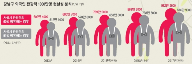 지난 5월부터 7월까지 메르스(중동호흡기증후군) 때문에 고전했지만 최근 빠르게 관광객이 증가하고 있다. 강남정보센터를 방문한 외국인 관광객은 지난 5월 3436명에서 8월에 6027명으로 75.4%가 늘었다. 코엑스는 6~7월에 콘퍼런스 5개가 취소됐지만 연기됐던 45개 회의가 7월 중순부터 순조롭게 진행 중이다. 가로수길에서 의류점을 하는 김모씨는 “5월 매출은 지난해의 절반이지만 지금은 80% 수준까지 늘었다”면서 “정부와 서울시 등도 외국인 관광객을 대상으로 홍보를 확대하길 원한다”고 말했다.