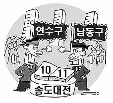 인천 송도국제도시 10, 11공구 관할권을 놓고 연수구와 남동구가 주민들을 동원하면서까지 수준 낮은 싸움을 벌이고 있다. ‘인천의 강남’으로 불리는 알짜배기를 놓고 벌이는 자치구 대립이 하도 치열해 ‘송도대전’이라는 말까지 나온다.