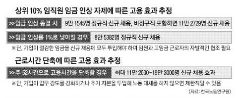같은 맥락에서 채용 형태를 상대적으로 임금수준이 낮은 비정규직까지 확대하면 11만 2729명을 신규 채용할 수 있고 상위 10% 임직원의 임금 인상률을 1%로 낮추기만 해도 정규직 8만 5382명을 새로 채용할 수 있다고 봤다. 업종별로는 제조업에서 5만 3814명, 사업지원서비스업에서 1만 9648명, 기술서비스업에서 5120명, 건설업에서 3113명, 금융보험법 등에서 3026명의 신규 채용이 이뤄질 것으로 분석했다. 또 노사정 합의대로 근로시간을 주당 52시간으로 줄이면 고용 효과가 11만 2000~19만 3000명에 이를 것으로 추정했다.