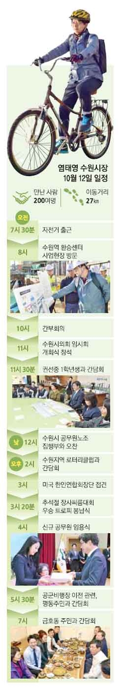 지난 12일 오전 7시 30분 염 시장은 자전거를 타고 집을 나섰다. 그는 중요한 행사나 회의가 없는 날에는 어김없이 자전거로 출근한다고 했다. ‘환경수도’의 시장으로서 탄소배출 절감 운동을 솔선수범하고 있는 것이다. 승용차를 타고 다닐 때 볼 수 없는 시내 도로 구석구석 상황을 직접 확인하고 시민들의 생생한 목소리를 들을 수 있는 것도 자전거 출근의 매력이다. 염 시장은 “정자동에서 수원역까지 서호천을 따라 자전거로 출근하는 시민과 학생이 의외로 많았다. 공영자전거 도입을 위해 내년부터 2018년까지 3년에 걸쳐 5740대의 자전거를 운영할 계획”이라고 말했다.