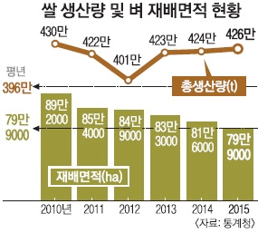 풍년의 결과는 2015년산 햅쌀 가격의 폭락이다. 통계청은 이달 5일 산지 쌀값은 80㎏들이 가마당 16만 3396원으로 지난해 같은 기간 17만 7844원보다 8.1% 떨어졌다. 최근 5년간 가격 중 가장 낮다.