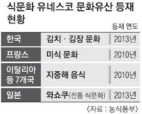 농림축산식품부는 20일 김치와 김장 문화의 유네스코 문화유산 등재 경험을 바탕으로 관계 기관 협업을 통해 본격 추진하겠다고 밝혔다. 이를 위해 한식 정책을 총괄하고 조정할 ‘한식정책협의회’를 발족하기로 했다. 한식정책협의회는 한식과 음식 문화, 관광과 관련된 사업이나 정책을 통합 조정하는 역할을 맡는다. 이동필 농식품부 장관과 김종덕 문화체육관광부 장관이 공동 위원장을 맡는다. 외교부와 농촌진흥청, 문화재청, 한식재단, 한국관광공사, 전문가들이 참여한다.