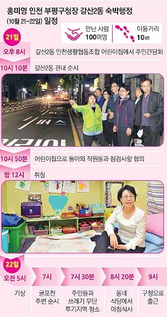 지난달 21일 오후 8시. 낮 업무를 마친 홍미영 인천 부평구청장이 갈산2동 인천생활협동조합 내 어린이집을 찾았다. 홍 구청장은 이곳에서 하룻밤을 묵으며 주민들과 대화를 나누고 현장을 둘러보기 위해 점퍼 차림으로 나섰다. 일명 ‘홍미영표 숙박행정’이다. 숙박행정은 2011년 11월부터 2012년 6월까지 관내 22개 동을 순차적으로 돌며 1박 2일로 진행되었는데 주민들의 반응이 좋아 올해 7월 재개했다. 올해 들어 여섯 번째 행사다.