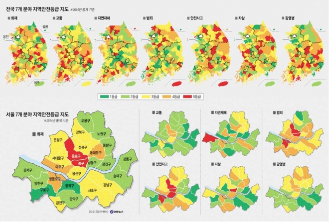 주민의 체감 안전도에 더 근접한 시·군·구 지역안전지수를 보면 일부 대도시 도심의 안전 취약성이 두드러졌다. 부산 중구와 광주 동구는 5개 분야에서, 서울 중구와 대구 중구는 4개 분야에서 최하등급을 받았다. 대구 달성군은 범죄를 제외한 6개 분야에서 최고등급을 받아 군 지역 중에서는 가장 안전 수준이 높았다. 경북 울릉군과 충북 증평군은 5개 분야에서, 서울 송파구, 부산 기장군, 인천 옹진군, 울산 울주군, 경기 수원·군포시는 4개 분야에서 1등급이 나왔다.