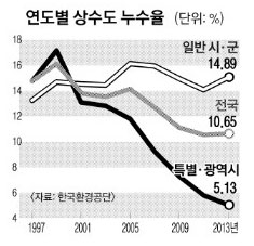 도농 간 누수율 격차도 심각하다. 특별시·광역시는 5.1%인 데 비해 일반 시·군은 14.9%로 3배 정도 높다. 상수관로 노후화가 원인으로 상수관망 정비 사업이 시급한 것으로 지적됐다.