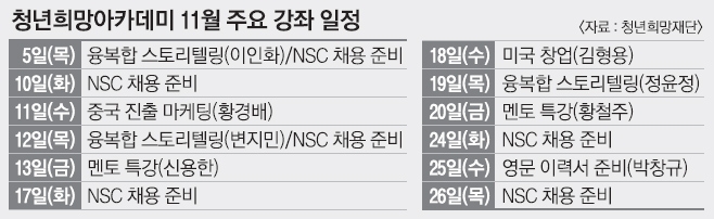이어 류 교수가 ‘희망의 원리’를 주제로 ‘융복합 스토리텔링’의 첫 강연을 했고 60여명의 취업 준비생들이 주의 깊게 경청하며 궁금한 점을 질문했다. 류 교수는 “기존의 현실을 따라서는 희망의 계기가 발견되지 않는다”면서 “지금까지 없었던 서비스와 콘텐츠, 시장 등에서 창의성과 상상력을 집중했을 때 밝은 희망이 보인다”고 말했다. 아카데미 무료 강연은 월요일부터 금요일까지 거의 매일 이뤄지는데, 이달 강연에서는 만화 작가 변지민씨, 드라마 작가 정윤정씨 등이 재능 기부를 할 예정이다. 강연에 참가하려면 청년희망재단 홈페이지(yhf.kr)를 통해 사전에 신청해야 한다.
