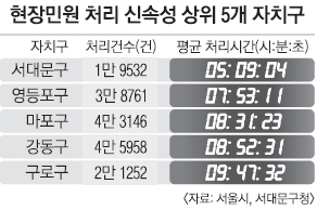 특히 서대문구의 민원 처리 속도는 매년 빨라지고 있다. 구는 2012년 38시간 52분에서 2013년 8시간 34분, 지난해 6시간 12분으로 평균 민원 처리 속도가 현저히 줄고 있다고 전했다. 구 관계자는 “민원 처리에 있어 주민 만족도의 잣대는 시간”이라면서 “빠른 처리를 위해 민원 기동반 가동, 부서별 민원 처리 실시간 모니터링 강화 등을 추진하고 있다”고 말했다. 실시간 모니터링은 소위 “우리 부서 담당이 아니니까 전화를 돌리겠다”며 이 부서, 저 부서로 업무를 미루는 것을 방지하기 위한 조치다. 부서별로 민원 처리의 신속성과 충실성 등을 미흡, 적정, 우수로 나눠 평가하고 소관이 아니라며 업무를 미루거나 허위 처리하면 징계하는 방침을 세워놨다. 반대로 실적이 우수한 부서나 직원은 표창을 주고 있다.