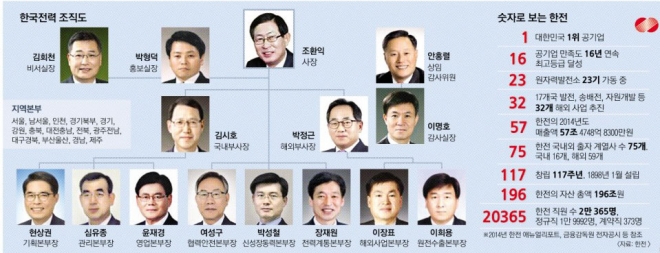 임직원 수는 올 상반기 기준 2만 365명(정규직 1만 9992명, 계약직 373명)이다. 한전이 출자한 계열사는 한국수력원자력, 한국남동·중부·서부·남부·동서발전 등 발전사(지분 100%)와 한국전력기술, 한전KPS, 한전원자력연료 등 국내 16개, 해외 59개 등 총 75개가 있다. 조직이 큰 만큼 본부장만 22명(본부 8명, 지역 14명)이고 1급 처·실장만 합쳐도 60명을 훌쩍 넘는다.