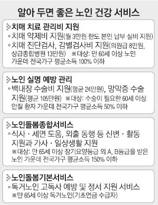 고령화로 만성질환을 앓는 노인 인구가 늘면서 노인을 위한 보건의료서비스도 다양해지고 있습니다. 소득 제한이 있어 모든 노인이 서비스를 받을 수 없는 점이 흠이지만 찾아보면 치매 검진이나 안과 질환 수술비 지원 등 유용한 제도가 많습니다. 알아 두면 좋은 혜택들을 모아 봤습니다.