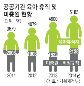 특히 총인건비 한도를 넘으면 경영평가에서 감점 요인이 됐다. 공공기관 육아휴직자는 2011년 3679명에서 지난해 5183명으로 꾸준히 늘고 있지만, 이를 대체 인력으로 뽑지 않거나 비정규직으로 채운 비율이 41%(지난해 기준)나 됐다.