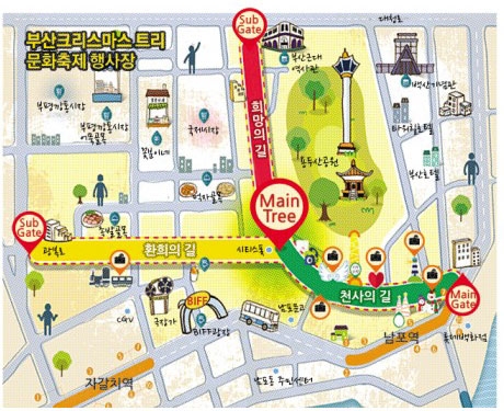 산타클로스, 사슴, 눈, 아기천사 등의 조형물을 장식해 크리스마스 분위기를 한껏 돋운다. 길가 곳곳에는 형형색색의 조명과 조형물들이 설치돼 한층 더 웅장한 분위기를 느낄 수 있도록 했다. 축제거리는 총 1160m으로 광복로 입구~시티스폿 440m는 ‘천사의 길’, 시티스폿~근대역사관 390m는 ‘희망의 길’, 시티스폿~국제시장 330m는 ‘환희의 길’ 등 세 곳으로 구분, 다양한 볼거리와 즐길거리를 마련했다.