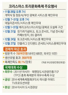 크리스마스트리축제는 유엔해비타트 산하 아시아도시연구소가 선정한 ‘2014 아시아 도시경관상’을 받는 등 명실상부한 아시아 대표적인 겨울 축제로 발돋움하고 있다. 트리문화축제조직위원회 정경내 기획실장은 “기본적으로 설치되는 각종 장식물이 부산의 대표적인 쇼핑 거리인 광복로 거리에 장식돼 거리를 찾아 걷는 것만으로 크리스마스 축제 분위기를 만끽할 수 있다”고 말했다.