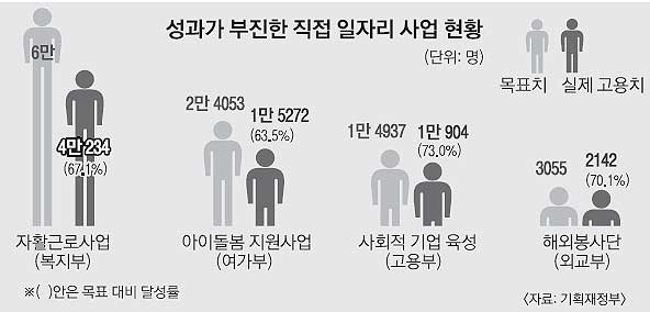 정부가 노인과 장애인, 저소득층 등 취약계층 일자리 지원을 위해 매년 1조원 이상의 예산이 투입되는 ‘직접 일자리 사업’을 진행하고 있지만 목표 대비 고용률이 70% 선에 그치는 것으로 나타났다. 시행과정에서의 편차를 감안하더라도 목표 미달률이 상당히 높다. 사업을 진행하는 각 부처가 예산을 짤 때 일자리 창출 규모를 부풀렸다는 비판이 나온다.