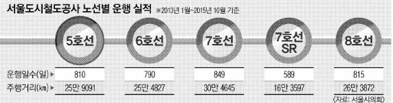 서울시의회는 2013년 1월부터 올해 10월까지 7호선의 전동차 운행 실적을 파악한 결과 전동차 ‘63개 편성’의 운행일수가 849일, 운행거리는 30만 4645㎞인 것을 확인했다. 정상 운행된 셈이다. 그러나 2012년에 추가로 도입된 ‘7개 편성’은 운행일수가 589일로 기존 전동차의 71.9%, 거리도 16만 3597㎞로 59.8%에 불과했던 것으로 드러났다. 7개 편성 전동차는 ‘SR전동차’로 좌석을 창 쪽이 아닌 가운데에 배치한 것이다.