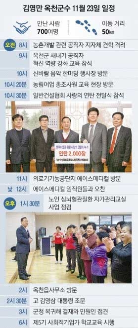 옥천읍사무소에 도착한 그는 고 김영삼 대통령의 국가장 기간을 고려해 예정됐던 노래교실 자치프로그램 교육장은 들르지 않았다. 직원들에게 업무보고만 받고 군청으로 돌아왔다. 김 군수는 오후 9시가 돼서야 귀가했다. 이날 역시 마지막 일정은 50여년 친구인 역기와의 싸움이다. 66㎡(20평)가 안 되는 작은 아파트가 김 군수의 거친 숨소리로 가득 찼다.