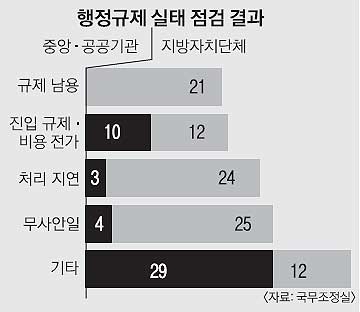 유형별로 규제 남용이 21건, 부당한 진입규제·비용 전가 22건, 처리 지연 27건, 무사안일 29건, 개선이 필요한 기타 사항 41건 등이다. 중앙행정·공공기관에서보다 주민 생활과 더욱 밀접한 시·군 등 지자체에서 이런 사례가 2배가량 많았다.