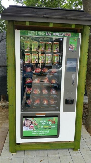 앞서 군은 올해 3000만원을 들여 국내 최초로 사과 자판기를 개발해 지난 8월부터 주왕산국립공원 입구와 인근 임업인종합연수원, 서울 서초구청 등 3곳에 시범 설치했다. 자판기 설치 및 운영, 품질 관리는 청송군 지방공기업인 청송사과유통공사가 맡고 있다. 자판기 사과값은 개당 1500원이며, 사과즙 1봉은 1000원에 판매되고 있다. 자판기 속 사과와 사과즙은 항상 저온 상태로 보관돼 신선도가 최상으로 유지된다. 1년 내내 커피나 음료수처럼 뽑아 먹을 수 있는 사과는 아삭아삭하고 오존수로 씻어 껍질째 먹을 수 있다.