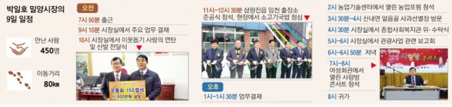 지난 9일, 박 시장의 바쁜 하루를 동행 취재하며 ‘38년간 준비한 시장’으로부터 밀양시 발전 방안과 구상도 틈틈이 들어봤다. 박 시장은 “밀양시 발전을 위해서는 농업·공업과 관광산업 등 3대 산업을 집중 육성해야 한다”고 강조했다. 그는 “밀양지역은 관광자원이 풍부하고 자연·지리적인 여건도 좋아 발전 잠재력이 충분하다”면서 “시장과 공무원이 앞장서고 시민들이 힘을 모으면 밀양 부흥을 반드시 이뤄낼 수 있다”고 자신감을 보였다.