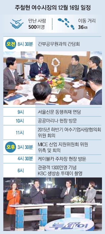 오후 4시 30분에는 강풍으로 운항이 중단된 여수 해상케이블카 현장을 방문했다. 전국 최초로 바다 위를 통과하는 해상케이블카는 지난해 12월 개통 이후 지난 15일까지 219만명이 찾은 여수의 대표 관광 상품이다. 시민단체들의 반대와 지역 경제계의 찬성 등으로 갈등이 계속되자 모든 책임은 내가 진다며 운항 허가를 내준 후 대박을 터뜨리고 있다. 운영회사인 여수포마㈜는 입장권 판매 수익금 일부와 건물사용료 등으로 올해 12억여원을 시에 기부했다. 130명의 고용 창출 효과도 거뒀다.