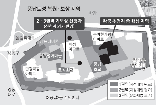 보상에는 국비와 시비를 각각 7대3으로 나눠 2855억원을 투입하고, 추가로 서울시가 지방채 2282억원을 발행해 모두 5137억원을 투입한다. 시가 발행한 지방채는 앞으로 문화재청이 보전한다. 내년 풍납토성 보상비는 올해보다 71억원 늘어난 571억원으로 확정했다.