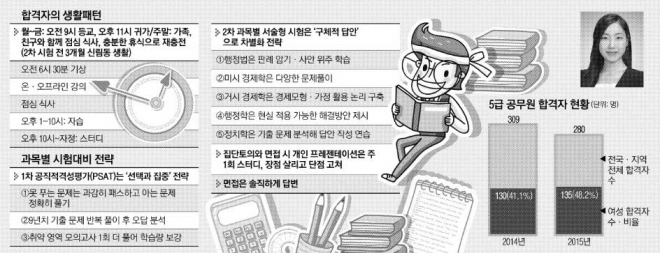올해 5급 공무원 공채시험에서는 여성 응시생이 11년 만에 최다 인원을 기록했다. 합격자 수도 지난해보다 6.1% 포인트 증가한 135명(48.2%)으로 강세를 보였다. 최근 5년 중 가장 많은 여성합격자가 나왔다. 5급 일반행정(전국) 수석으로 합격한 김세진(25·서강대 정치외교학과 4학년)씨는 서울 은평구 예산팀장 김석수(55)씨의 딸이라는 사실이 알려지면서 화제를 모으기도 했다. 서울신문은 내년 시험을 앞두고 있는 수험생을 위해 올해 5급 수석 합격자에게 3년 6개월에 걸친 수험생활과 시험 대비법을 들어봤다.