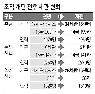 일선세관은 41개에서 29개로 통합되고 기능에도 변화가 생긴다. 5급이 세관장인 18개 가운데 구로·고성세관 등 5개는 인접한 4급 세관에 흡수되고, 13개는 6개로 통합한 뒤 4급으로 직급이 상향된다. 이로써 기존의 5급 세관장은 ‘역사 속으로’ 사라지게 됐다.