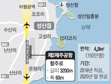 제2공항 건설 타당성 연구용역팀이 공항 사업비로 4조 1000억원을 예상했고 이 중 토지 보상비로 책정한 금액은 약 5000억원이다. 나머지 3조 4000억원 안팎은 공항건설비, 2000억원가량은 설계 등 부대비용으로 사용한다는 계획이다. 제2공항 예정지는 제주도 서귀포시 성산읍 고성·난산·수산·신산·온평리 등 5개 마을로, 부지 면적이 495만 8000㎡다. 현재 이 지역 공시지가보다 단위 면적당 3배 가까이 비싼 3.3㎡(평)당 평균 30만원대의 보상금이 예상된다. 온평리의 올해 표준지(64필지) 공시가격은 3.3㎡당 평균 9만 6437원이다.