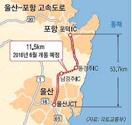 터널 등 나머지 11.5㎞가 내년 6월 개통하면 울산에서 포항까지 32분이면 도착할 수 있다. 통행거리는 21㎞(74.5㎞→53.7㎞), 시간은 28분(60분→32분) 줄어 물류비용이 연간 1300억원 절감될 것으로 기대된다. 이 고속도로가 완전 개통되면 동해 남부권의 간선 축이 완성돼 포항~부산을 1시간에 오갈 수 있게 된다. 울산~포항고속도로는 2009년 착공, 2조원이 투입됐다.