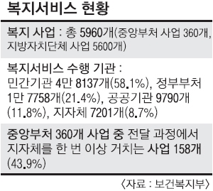 문제는 복지전달 체계입니다. 중앙 부처와 지자체 복지 사업의 절반 정도는 시·군·구와 읍·면·동을 통해, 나머지는 민간 기관과 공공기관, 국민연금공단 지부, 국가보훈처 지소 등을 통해 전달되고 있습니다. 복지사업은 비약적으로 증대했으나 전달 체계는 매우 복잡합니다. 읍·면·동, 민간 기관, 국민연금공단 지부 등을 직접 찾아다니며 복지서비스를 신청해야 하다 보니 정확한 정보제공과 맞춤형 설계가 이뤄지지 못하고 있습니다. 복지가 꼭 필요한 사람에게 맞춤형으로 전달되는 게 아니라 기존에 서비스를 받고 있던 사람에게 편중되는 쏠림 현상이 나타나고 있습니다. 국민의 복지 체감도가 떨어질 수밖에 없습니다.