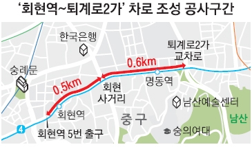 4일 시의회 최판술 의원에 따르면 시는 올해부터 우선 회현역 5번 출구부터 회현사거리까지 0.5㎞ 구간의 공사를 시작한다. 현재 이곳은 왕복 6∼10차로에 차로 폭은 35∼52m, 보도 폭은 3.4∼5.8m다. 시는 지난해부터 사대문 안의 도로를 보행친화적으로 바꾸기 위해 차로의 수를 줄이고 있다. 시 관계자는 “4월까지 서울역 고가 폐쇄에 따른 교통량 변화를 반영해 도로폭과 차로 수를 줄일 계획”이라고 설명했다. 회현사거리부터 남산 예장자락 입구인 퇴계로 2가 교차로 0.6㎞ 구간의 공사도 진행한다.