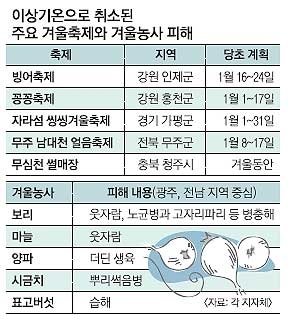 겨울 같지 않은 포근한 날씨가 이어지면서 겨울축제장과 농민들의 주름이 깊어지고 있다. 5일 자치단체와 농민들에 따르면 예년 평균보다 2~6도 높은 기온이 이어지면서 눈·얼음 테마 겨울축제들이 속속 취소되고 웃자람과 병충해로 겨울 농사를 짓는 농민들이 울상을 짓는 등 피해가 속출하고 있다. 슈퍼 엘니뇨 영향으로 올겨울에 한반도에 따뜻한 공기가 유입돼 일어나는 현상이다. 당장 겨울축제를 취소하거나 축소하면서 축제를 준비하던 지자체들이 타격을 받고 있다. 겨울철 관광객 유치로 지역경제를 활성화하겠다는 계획이 물거품이 되고 있기 때문이다.