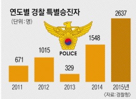 10일 경찰청에 따르면 2014년 8월 강 청장 취임 이후 특진자는 가파른 증가세를 보이고 있다. 2013년 329명에서 2014년 1548명으로 4.7배가 됐고, 지난해에는 다시 전년의 1.7배로 증가했다. 경찰 전체 승진자 중 특진자가 차지하는 비율도 2013년 9%, 2014년 10%에 이어 지난해에는 20%에 달했다.