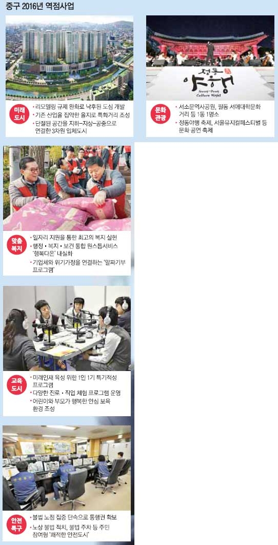 지난 한 해를 평가해 달라는 말에 최창식 중구청장의 표정이 다소 어둡더니 금세 밝아졌다. 취임 초기와 비교하면 문화를 보는 시선이 180도 달라졌다. 대형 공사를 주도해 왔던 그는 문화 정책에선 거의 문외한이었다. 처음에는 “무슨 문화 행사에 이렇게 큰 비용이 들어가나”라는 말이 늘 나왔단다. 그런 그가 요즘은 “문화가 밥그릇”이란 말을 입에 달고 다닌다. 중구에는 충무공 이순신 생가터와 서애 유성룡의 고택터, 성곽길, 서소문 성지, 성공회서울성당, 혜민서터, 주자소터 등 역사적 가치와 이야기가 있는 문화 자원이 많다. 그는 “역사성을 보존하고 관광명소로 개발하면 중구뿐만 아니라 서울의 품격과 경쟁력도 크게 높일 수 있다”고 확신에 차 말했다.