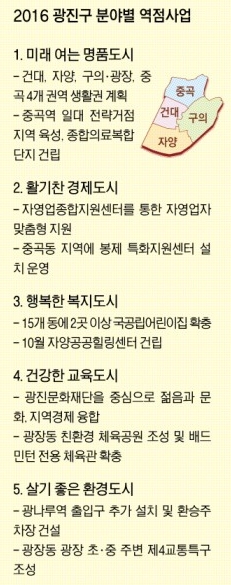 김 구청장은 현재 중곡, 건대, 자양, 구의·광장 등 4개 권역별로 지역생활권 계획을 수립해 추진 중이다. 7호선 중곡역 일대는 부도심 기능을 할 전략 거점 지역으로 특화 개발해 지역 발전과 고용 창출이 이뤄지도록 할 계획이다. 특히 광진구는 이 일대에 서울시와 함께 종합의료복합단지를 조성할 예정이다. 앞서 지난해 국립 정신건강연구원과 임상센터를 준공 완료했다. 2018년까지 이를 바탕으로 의료행정타운과 바이오비즈센터를 세워 첨단 의료·바이오 산업의 메카를 만들겠다는 야심 찬 계획을 갖고 있다. 건대역 주변은 의료관광과 패션, 맛의 중심지로 만들 예정이다. 자양과 구의·광장은 비즈니스에 적합하도록 관광호텔, 지식정보 산업체 위주의 발전을 꾀하고 있다.