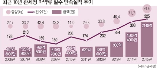 17일 관세청이 발표한 2015년 마약류 밀수 단속 동향에 따르면 지난해 적발한 마약류는 91.6㎏(325건)으로 전년(71.7㎏) 대비 27.8% 증가했다. 2010년(14㎏) 이후 5년 연속 늘었다.