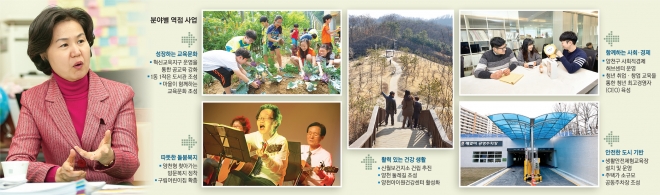 “떠드는 것보다 일하는 게 좋다”는 김 구청장이 들어온 뒤 양천구는 허황된 개발 청사진 대신 생활을 바꾸는 정책을 중심으로 구정을 바꾸고 있다. 김 구청장은 “올해 서울형 혁신교육지구로 선정돼 서울시와 교육청으로부터 10억원의 예산을 받은 것에 5억원을 더해 마을방과후 강사 양성과 진로직업교육 등 5개 분야 23개 사업을 진행한다”면서 “이 과정에서 방과후학교 등을 연계한 사회적기업 건립도 계획하고 있다. 엄마들이 교육을 받은 뒤 아이들 방과후 교사가 되는 시스템을 마련해 혁신교육과 일자리 창출 사이에 선순환 구조를 만들 것”이라고 말했다.