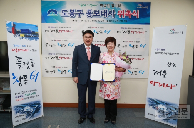 서울 도봉구는 24일 앞으로 2년 동안 방송인 김미화씨를 구 홍보대사로 위촉한다고 밝혔다. 최근 도봉구 쌍문동 배경의 드라마 ‘응답하라 1988’에서 김씨가 순악질 여사를 연기하며 썼던 유행어가 다시 나와 인기를 끌었다. 김씨는 현재 서울시 홍보대사로도 활동 중이다.