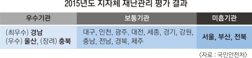 미흡기관으로 선정된 서울, 부산, 전북은 부서 간 협업 등이 부족한 데다 폭염과 풍수해 등 자연재해 발생 시 부기관장급 이상의 현장 방문이 다른 지자체보다 적어 재난관리에 대한 관심도나 의지가 떨어지는 것으로 평가됐다. 반면 우수기관으로 꼽힌 경남은 만화 형태의 재난관리 표준교재를 개발, 보급하고 유관 기관 합동 비상근무를 조기 실시한 점 등에서 좋은 평가를 받았다. 안전처는 재난관리가 미흡한 지자체에 대해 기관별로 맞춤형 전문 컨설팅을 제공할 계획이다.
