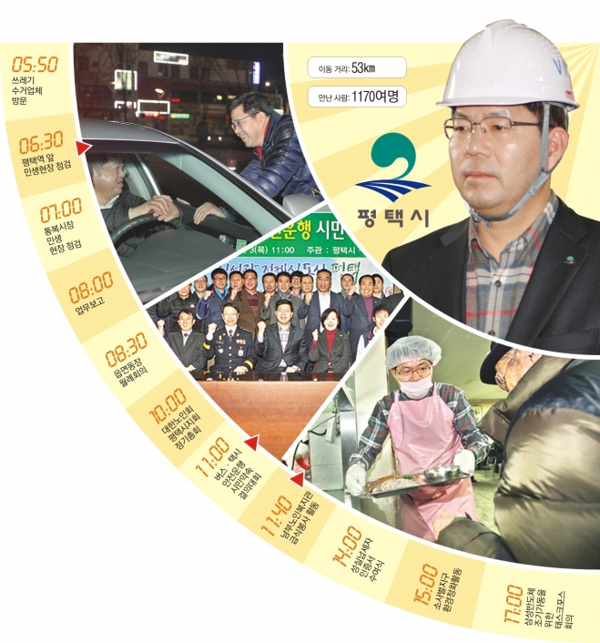 그는 이후에도 2건의 개인 일정을 소화한 후 밤 10시쯤 집으로 향했다. 이동 중에도 전화로 업무를 보고받거나 지시를 내렸다. 지역이 넓다 보니 이런 일은 생활화가 됐다. 평택시장의 하루는 이렇게 저물어 갔다.