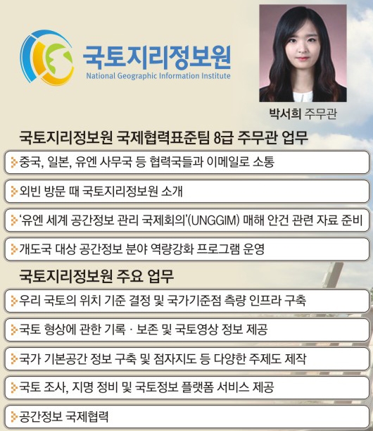 국토지리정보원에서 일하는 공무원은 일반직(행정, 측지), 관리·운영직, 연구직으로 나뉜다. 직렬에 따라 입직 경로도 다르다. 행정직은 인사혁신처 주관 공개경쟁채용, 지역인재채용 시험 등을 거친다. 측지직, 관리 운영직, 연구직 등은 전문성을 요구하기 때문에 직무 관련 응시 자격을 지정하는 경력경쟁채용 방식으로 선발한다. 2014년 11월 경채를 거쳐 입직한 박서희(25) 주무관(8급)은 2년째 기획정책과 국제협력표준팀에 몸담고 있다.