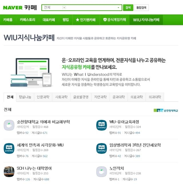 순천향대는 17일 교육부와 한국대학교육협의회의 ‘학부교육 선도대학(ACE) 육성사업’ 우수 사례 공모에서 이 대학이 네이버에 개설한 ‘내가 이해한 지식나눔 카페’가 최우수 사례로 선정됐다고 밝혔다.